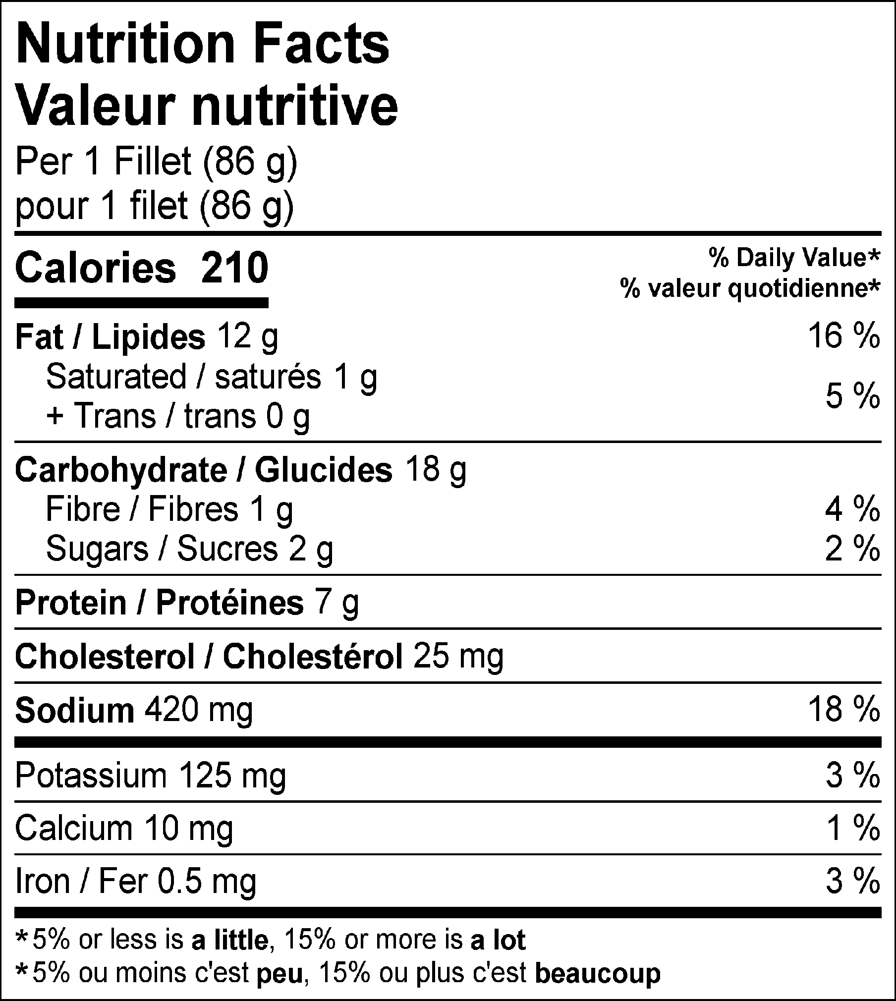 Ingrédients: Filets de goberge • Farine • Huile végétale • Eau • Amidon de maïs modifié • Dextrine de tapioca • Sucre • Sel • Poudre à pâte • Huile de palme modifié • Petit-lait • Poudre d’oignon • Méthylcellulose • Levure • Extraits de paprika et curcuma • Arôme naturel • Phosphate de sodium (pour retenir l'humidité du poisson).